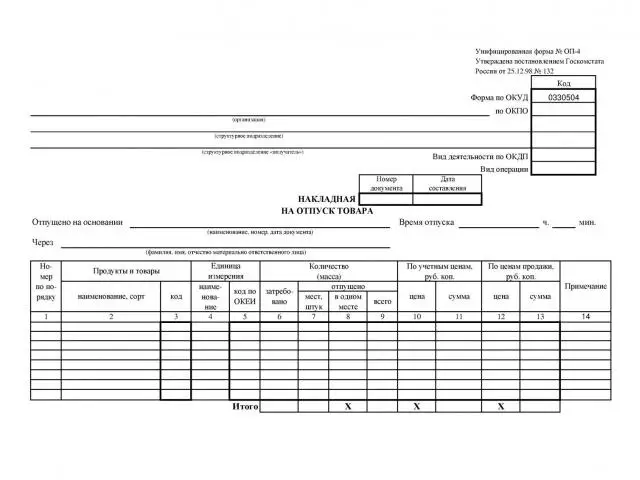 В кафе, ресторанах и других предприятиях общественного питания для отпуска товаров со склада используют накладную на отпуск по форме ОП-4. Также отпуск продуктов или тары со склада (кладовой) на кухню, то есть в производство, или буфеты, мелкорознечную сеть оформляется через накладную по форме ОП-4. (Код по форме ОКУД 0330504).Кроме того накладная на отпуск товара применяется при единоразовом отпуске готовых изделий с кухни в филиалы, буфеты, мелкорозничную сеть, раздаточную, если она существует отдельно от основного цеха.