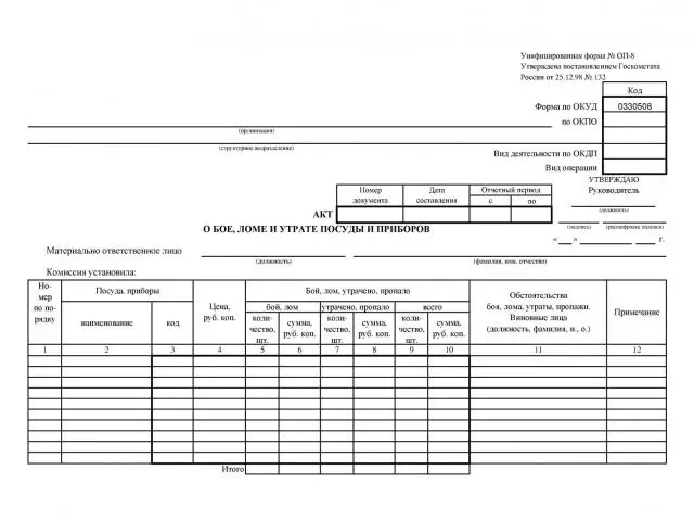 Форма ОП-8. Акт о бое, ломе и утрате посуды и приборов
